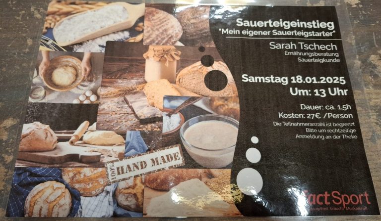 Im Fact Fitness Studio in Pocking bieten wir einen Sauerteigkurs "Mein eigener Sauerteigstarter" an. In diesem Kurs wird das richtige Ansetzen und Pflegen eines Sauerteigs vermittelt. Des Weiteren gibt es die wichtigsten Utensilien für zu Hause, for free.